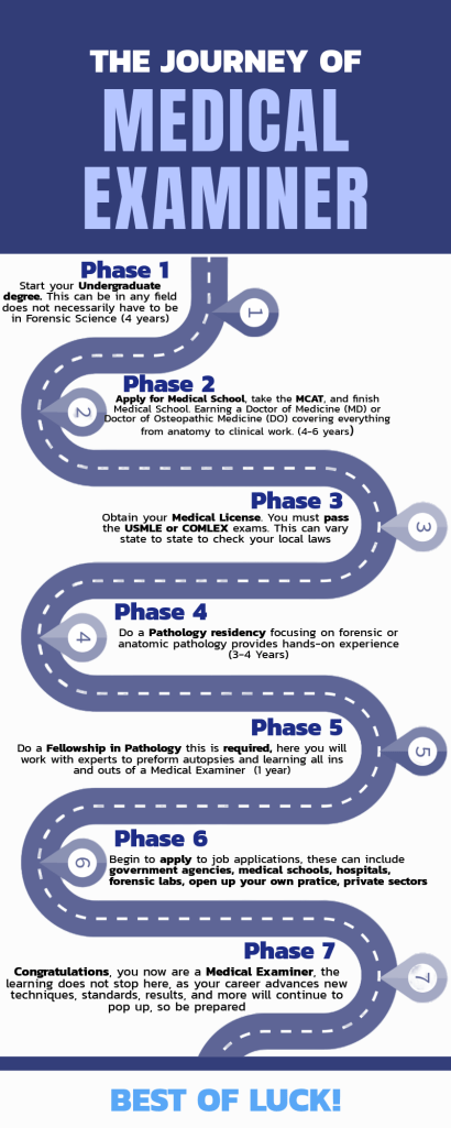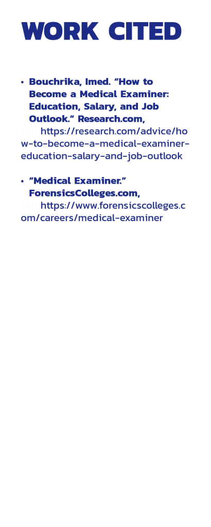 How to become a Medical Examiner is a project with the goal of educating anyone who is interested in the field of forensic science or has no direction in their professional career. The creation of this infographic has educated me in the timeline of this career and allows me to have a better understanding of how long the process is. By using research from sources deemed credible by my professor, I looked for key terms or words. This allowed me to pull only the most relevant and necessary information for the education of the audience. This project features “Phases” that are used to appeal to the audience, making the infographic easier to understand and read. Important words or key ideas are in bold texts which allow the audience to gravitate towards those words, allowing for a better understanding and it being drawn to their attention. As a result, the infographic is tailored to be easy to understand for all.
